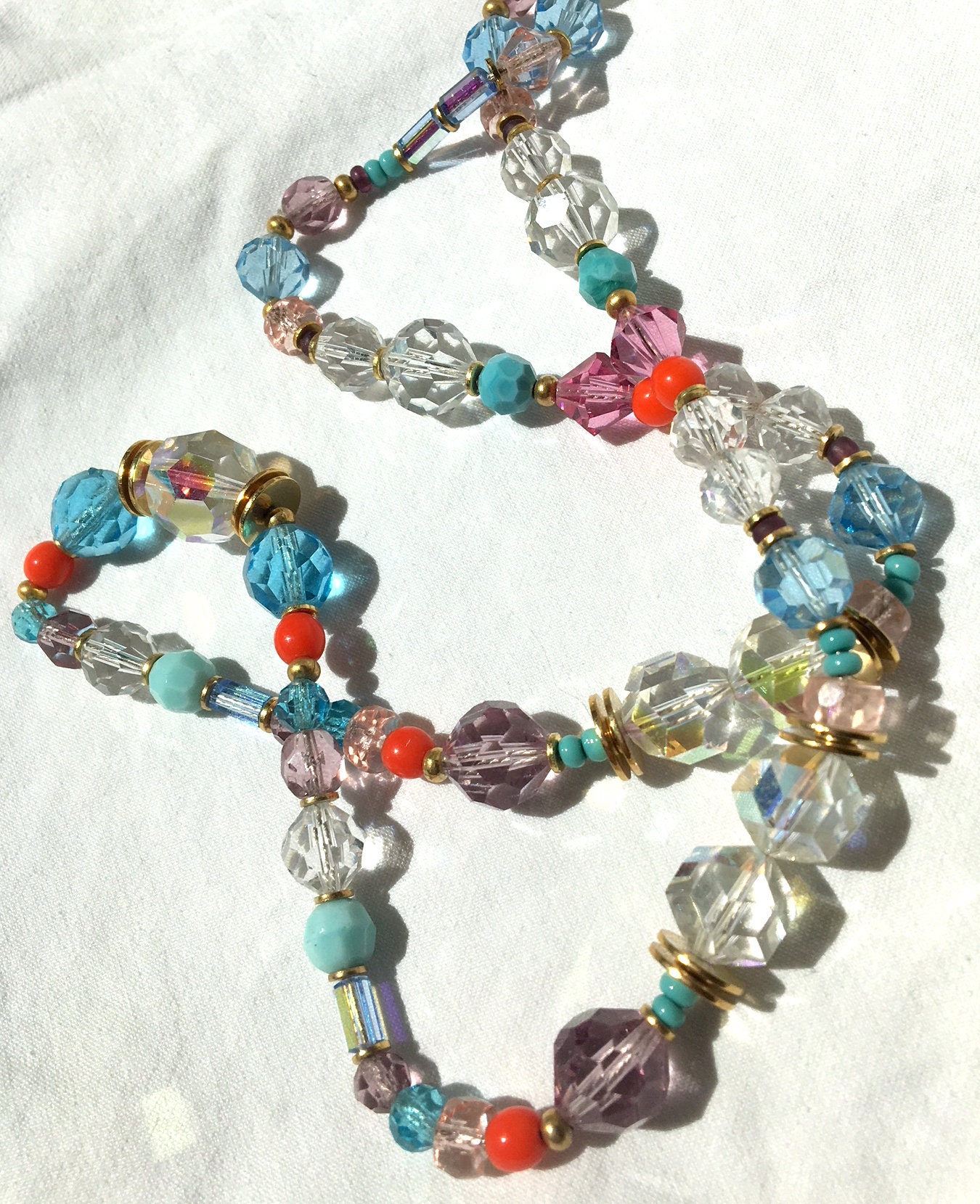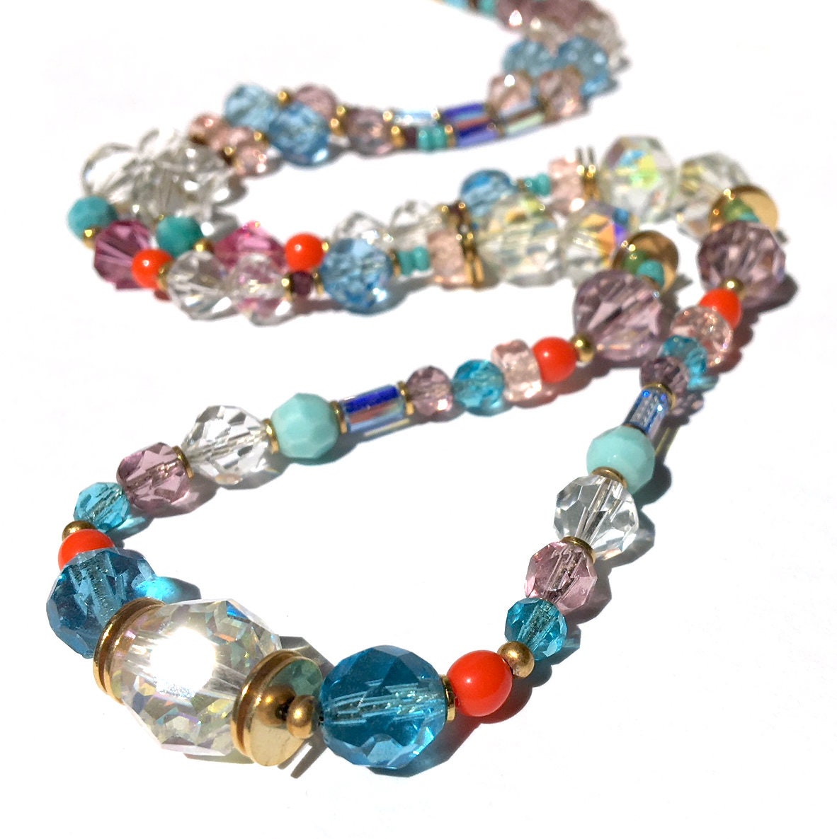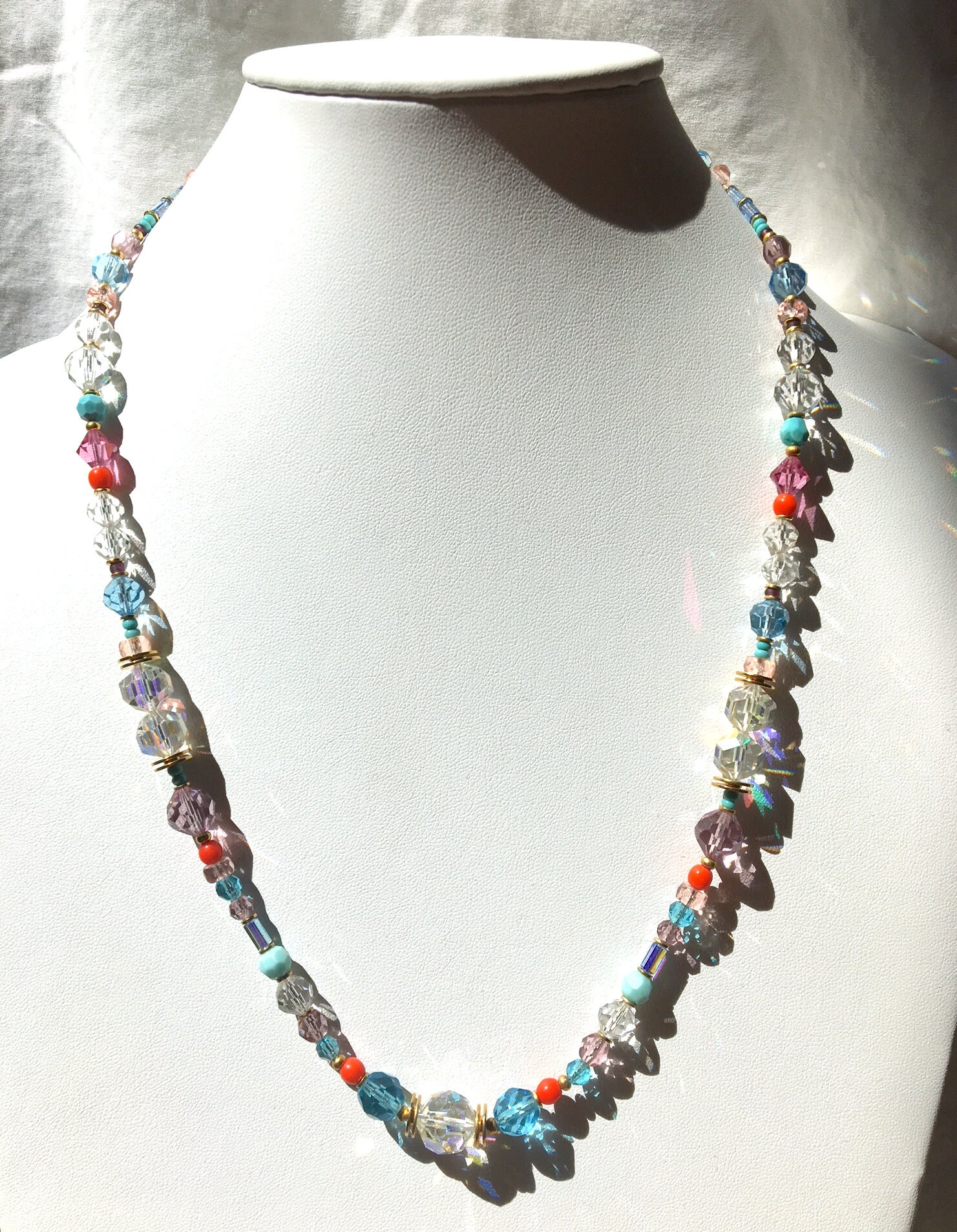 24 inch crystal necklace. Multi-colored Austrian crystal in shades of turquoise, light rose, light sapphire and aquamarine from our collection. Many of the beads are rare and irreplaceable, circa 1920, originating from Czechoslovakia, Bavaria, Wattens, Kobe and Milano. Metal parts from our own tooling are 14 karat gold overlay on bronze. "Miami Beach" necklace was hand made in the USA.