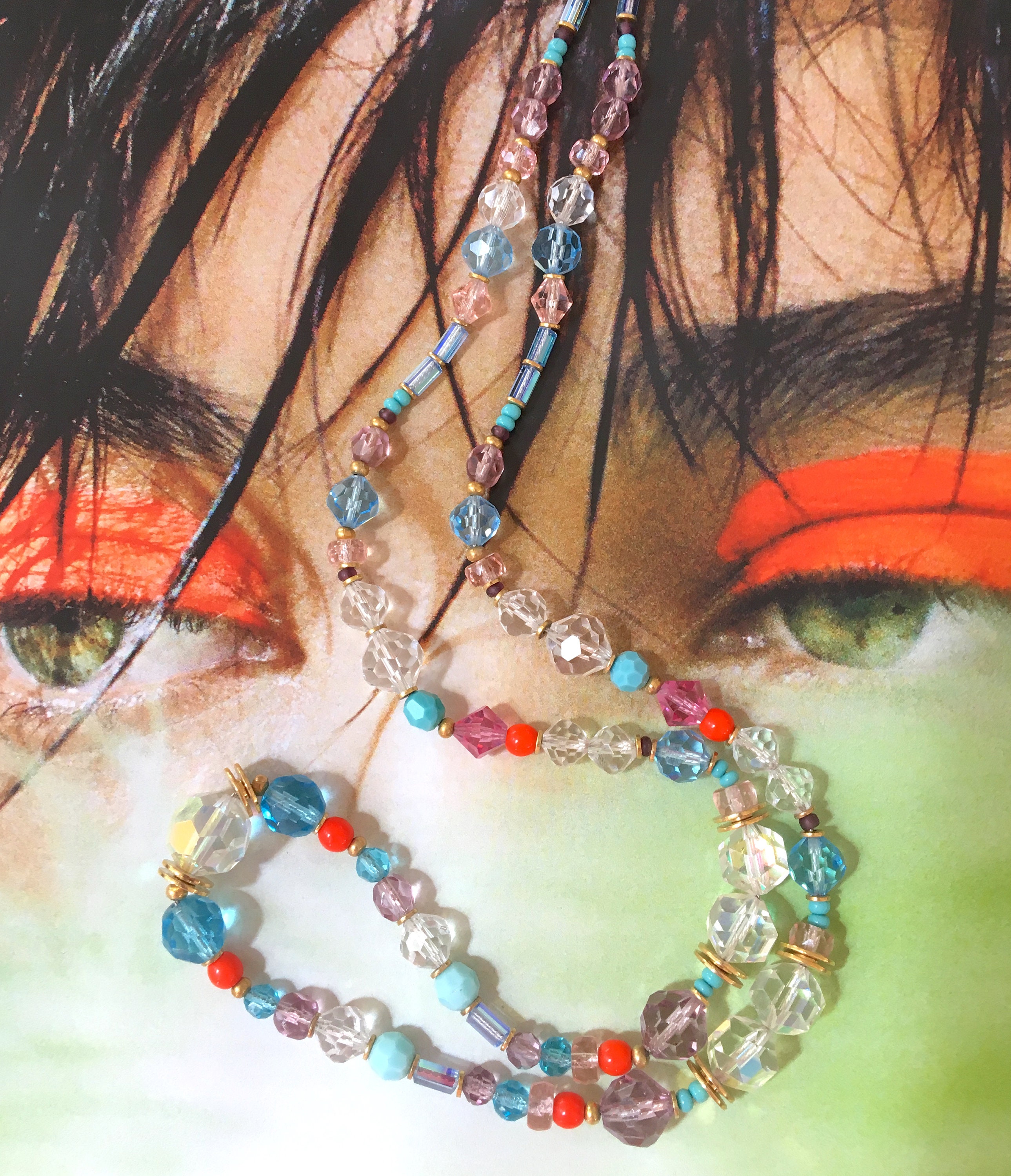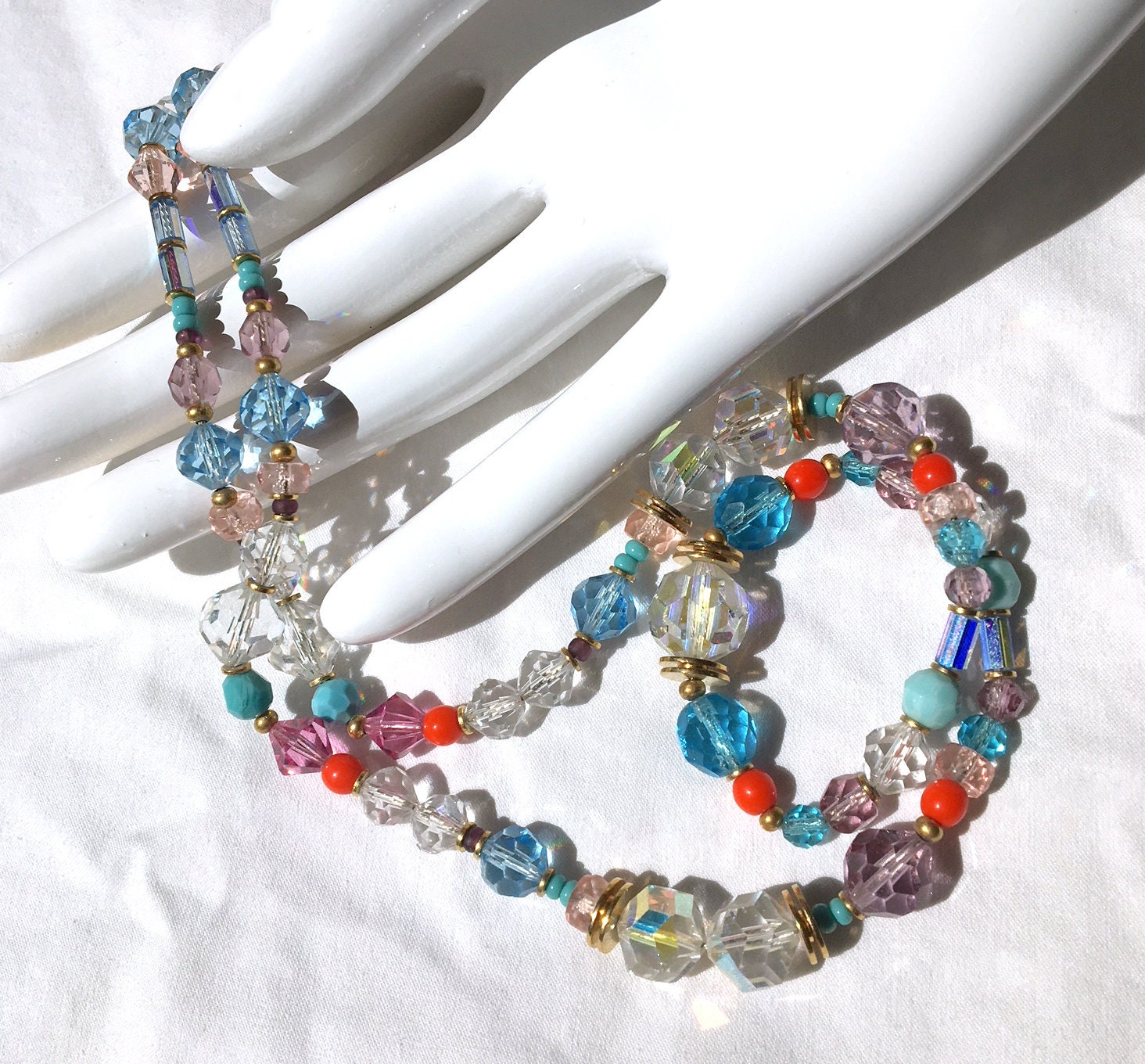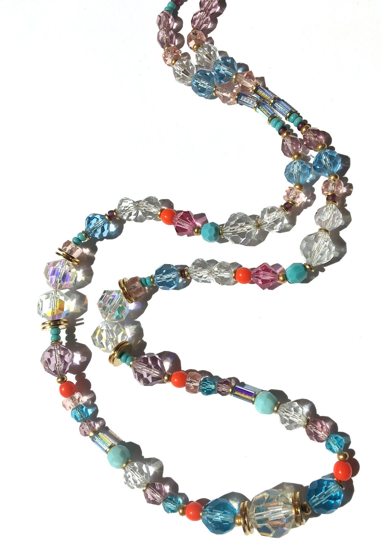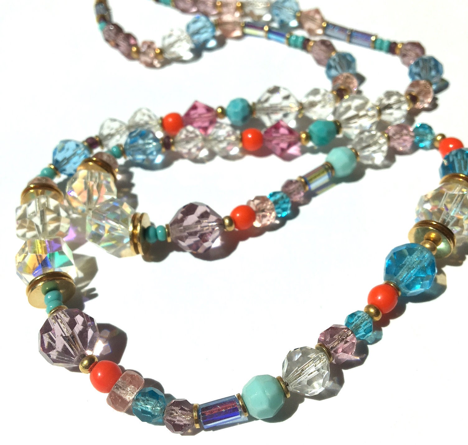 24 inch crystal necklace. Multi-colored Austrian crystal in shades of turquoise, light rose, light sapphire and aquamarine from our collection. Many of the beads are rare and irreplaceable, circa 1920, originating from Czechoslovakia, Bavaria, Wattens, Kobe and Milano. Metal parts from our own tooling are 14 karat gold overlay on bronze. "Miami Beach" necklace was hand made in the USA.