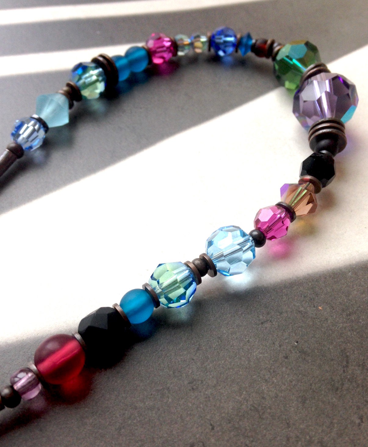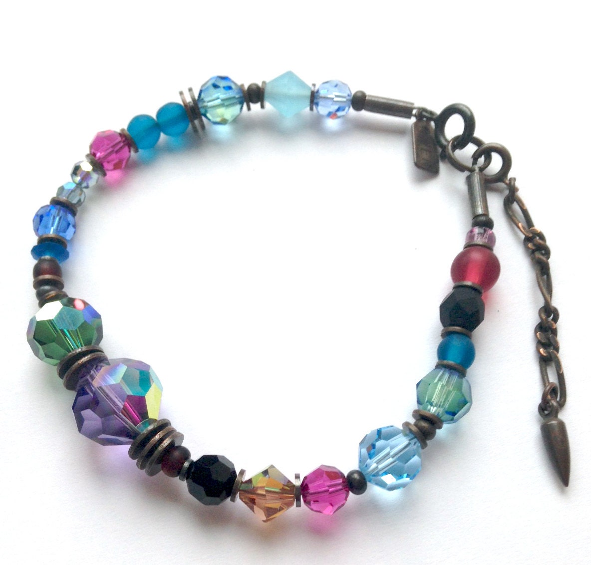 Austrian crystal and Czechoslovakian glass from our collection in shades of amethyst, tourmaline green, aquamarine and jet. Metal parts from our own tooling are antiqued bronze. "Topkapi" bracelet is 7 inches long, handmade in the USA. A 1 inch extender is included.