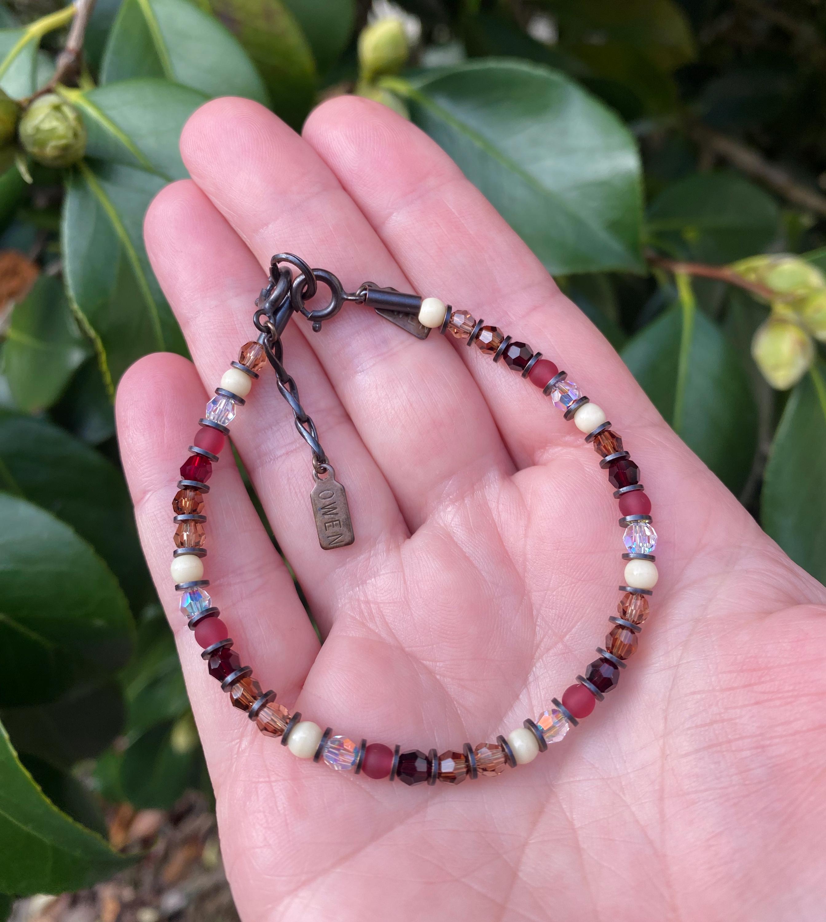 Beaded stacking bracelet. Austrian crystal and Czechoslovakian glass bracelet in shades of garnet, smoke topaz and crystal. "Strauss Waltz" bracelet is 7 inches long with a 1-inch extender included. Metal accents are antiqued bronze, from our own tooling. All handwork done in the USA.