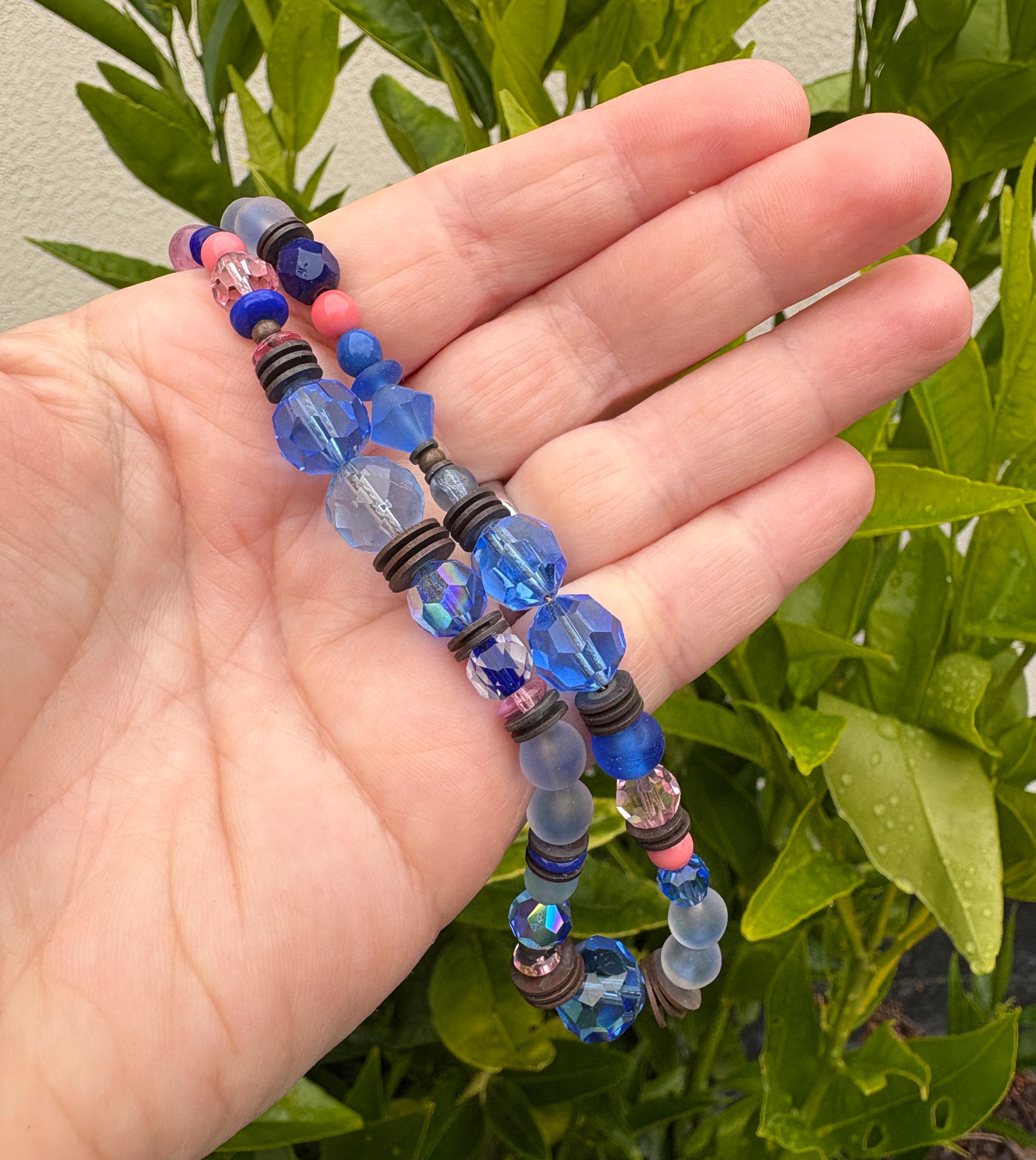 Pink and blue Art Deco crystal choker necklace. Austrian crystal and Czechoslovakian glass from our collection in shades of sapphire, cobalt, light sapphire, and rose pink. Many of the beads are rare and irreplaceable, originating from Czechoslovakia, Bavaria, Wattens, Kobe, and Milano. Metal parts from our own tooling are antiqued bronze. "Sky Patrol" is 15 inches long, handmade in the USA.