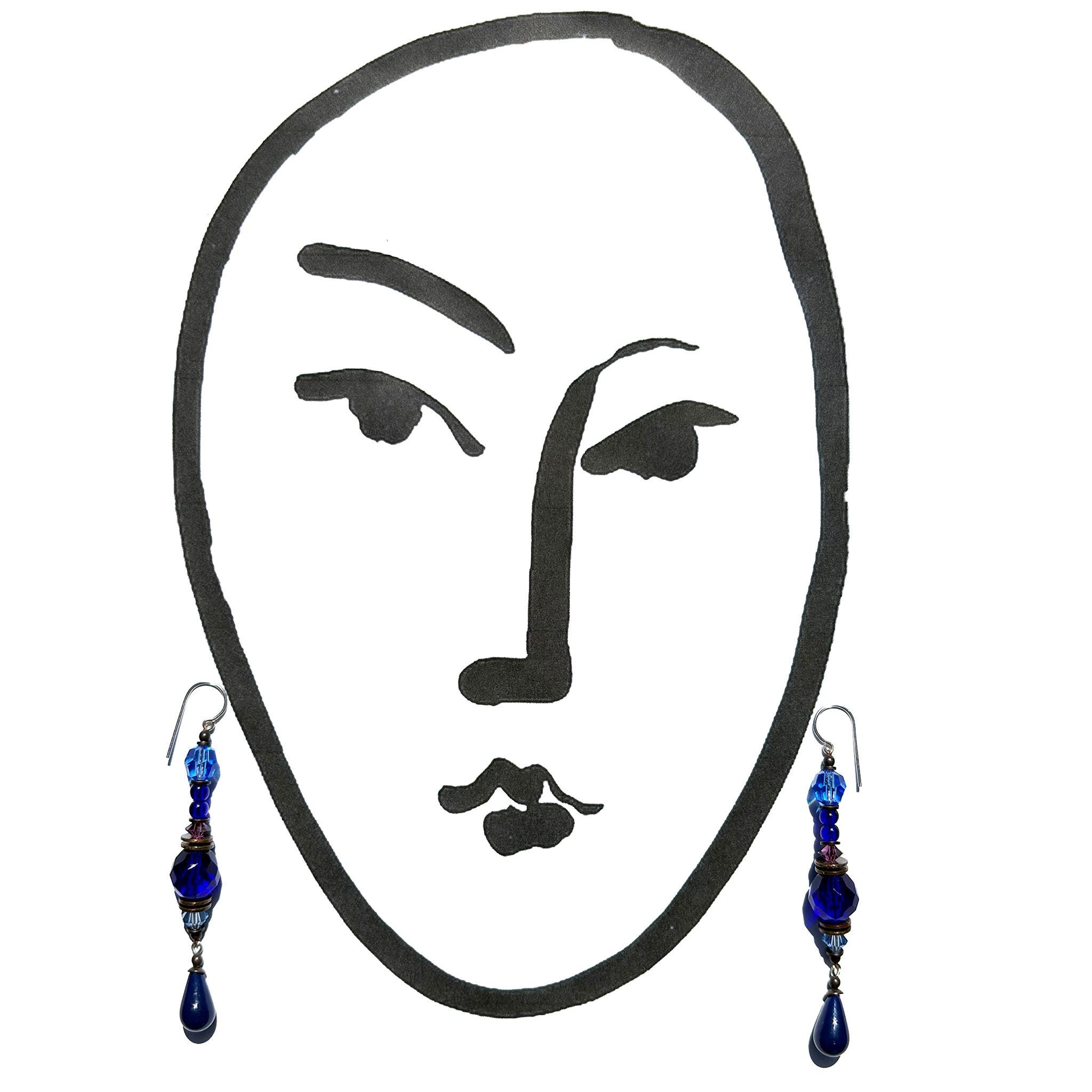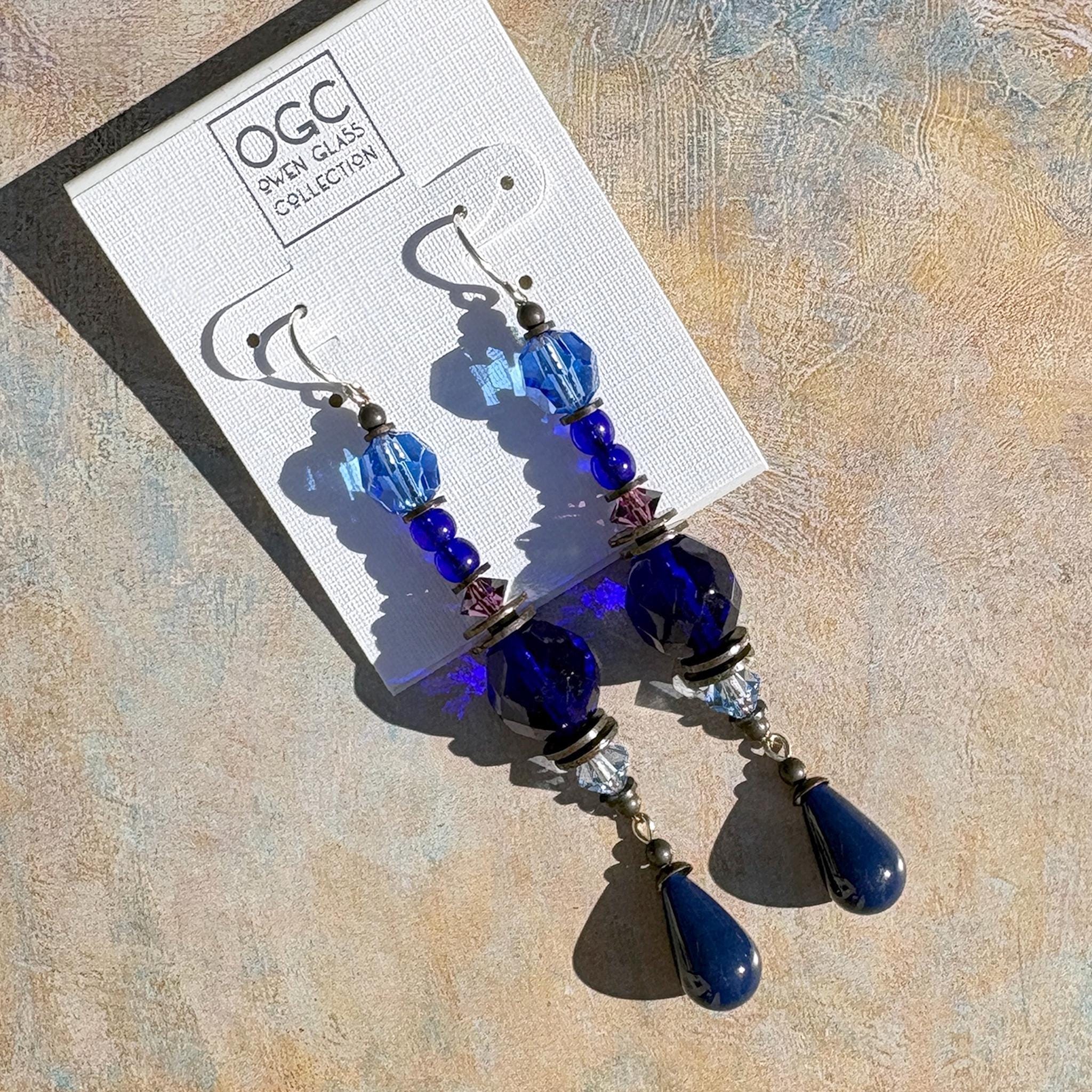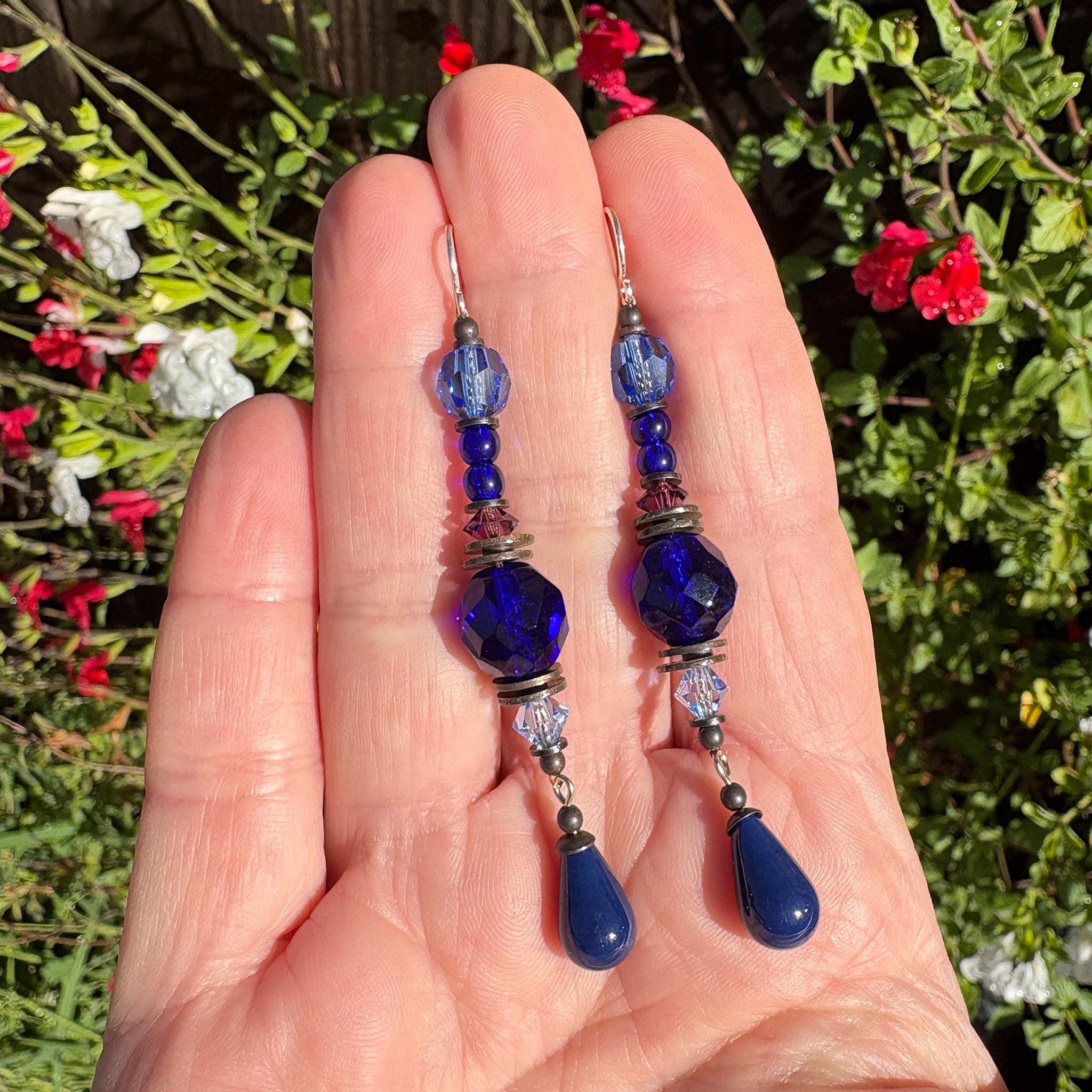 Shoulder duster earrings "Feeling Good About #1" in shades of cobalt, sapphire and amethyst. Antique Czechoslovakian cobalt glass drops circa 1920-1930, Austrian crystal and German glass. "Feeling Good About #1" shoulder dusters measure 2.5 inches long. Antiqued bronze accents with sterling silver wires. All hand work done in the USA.