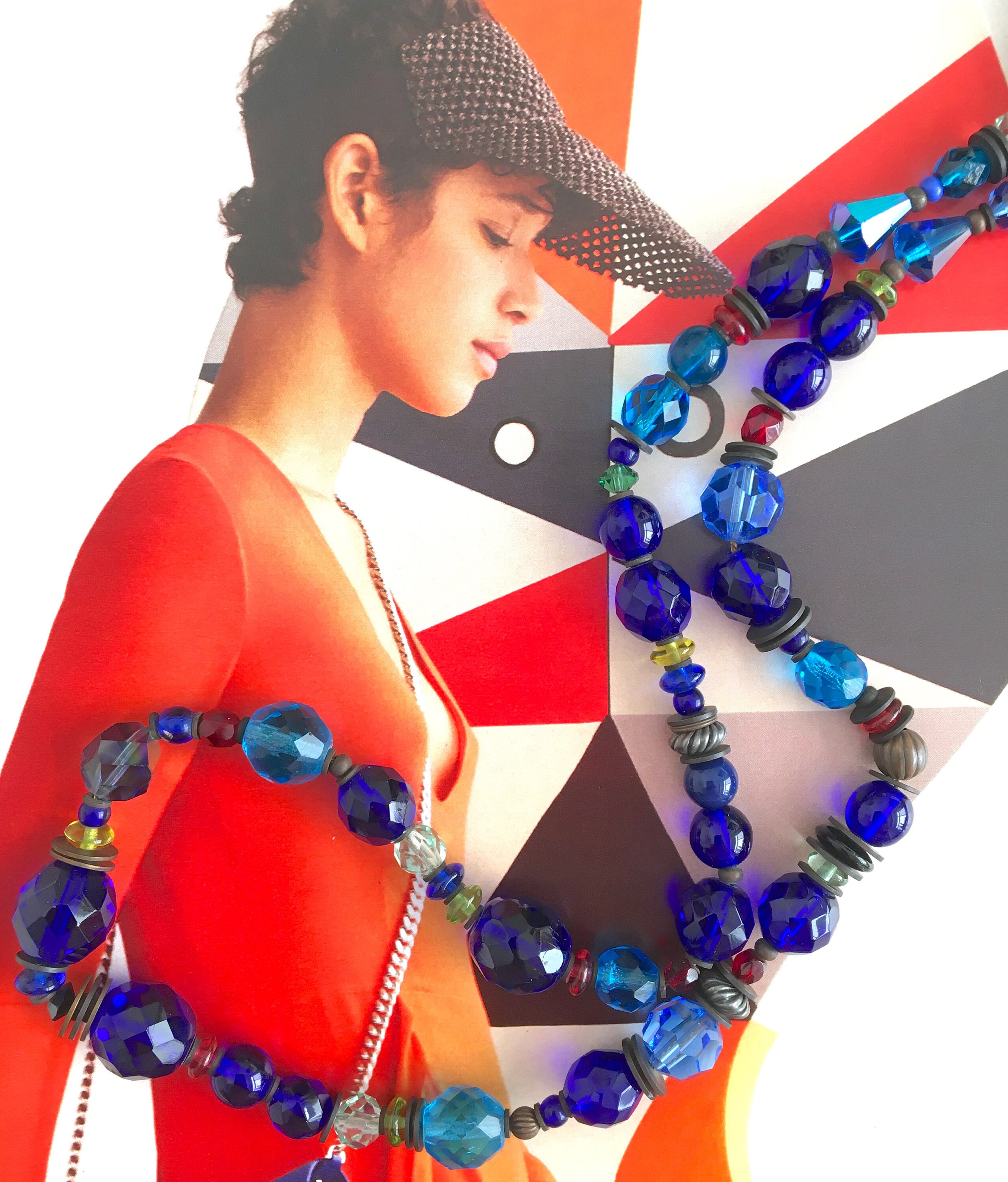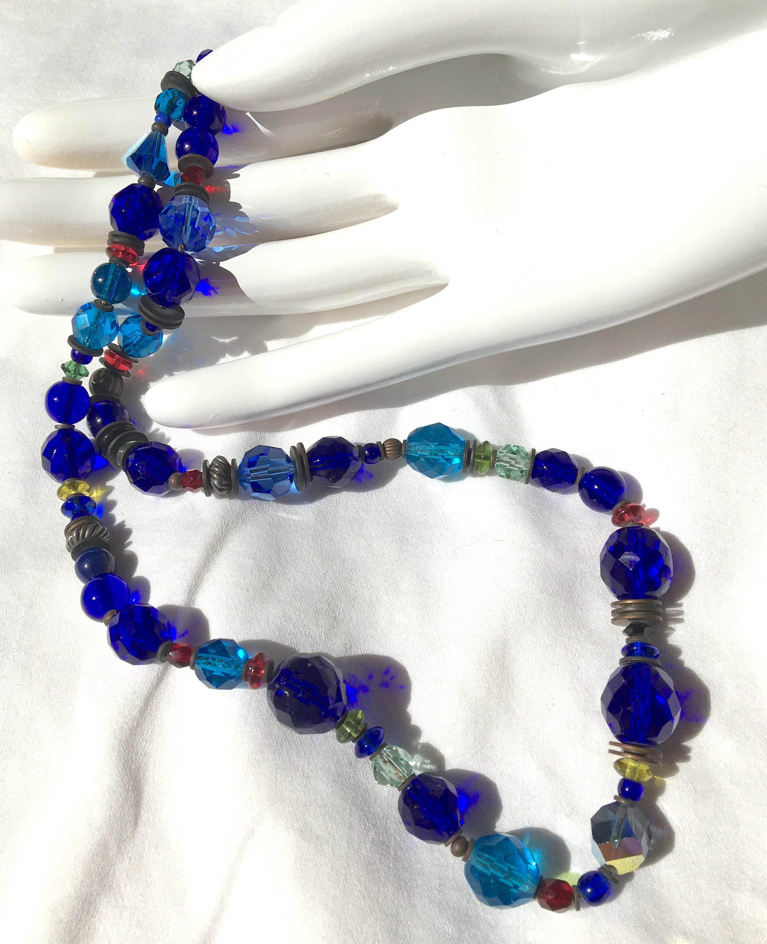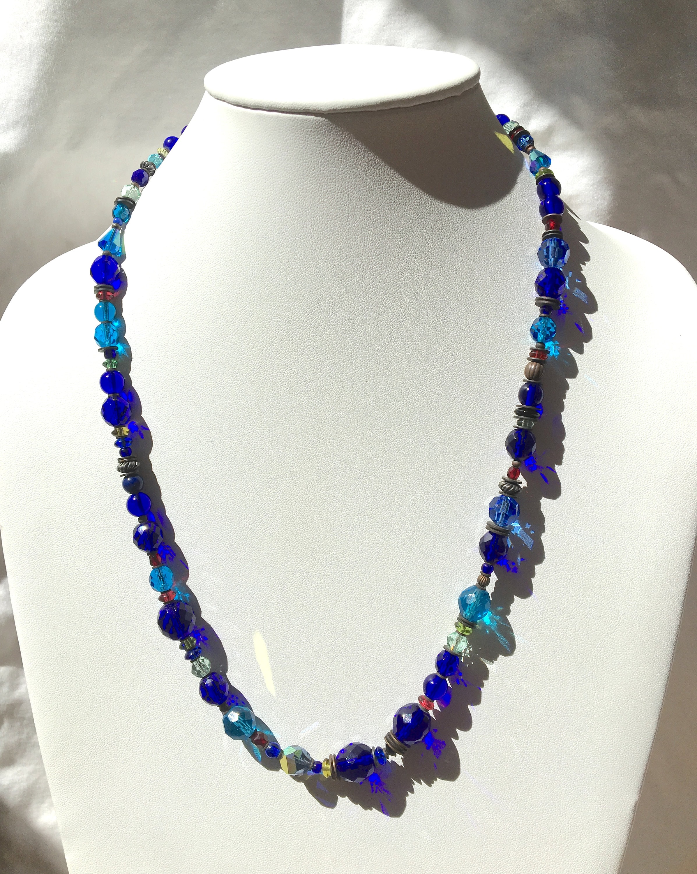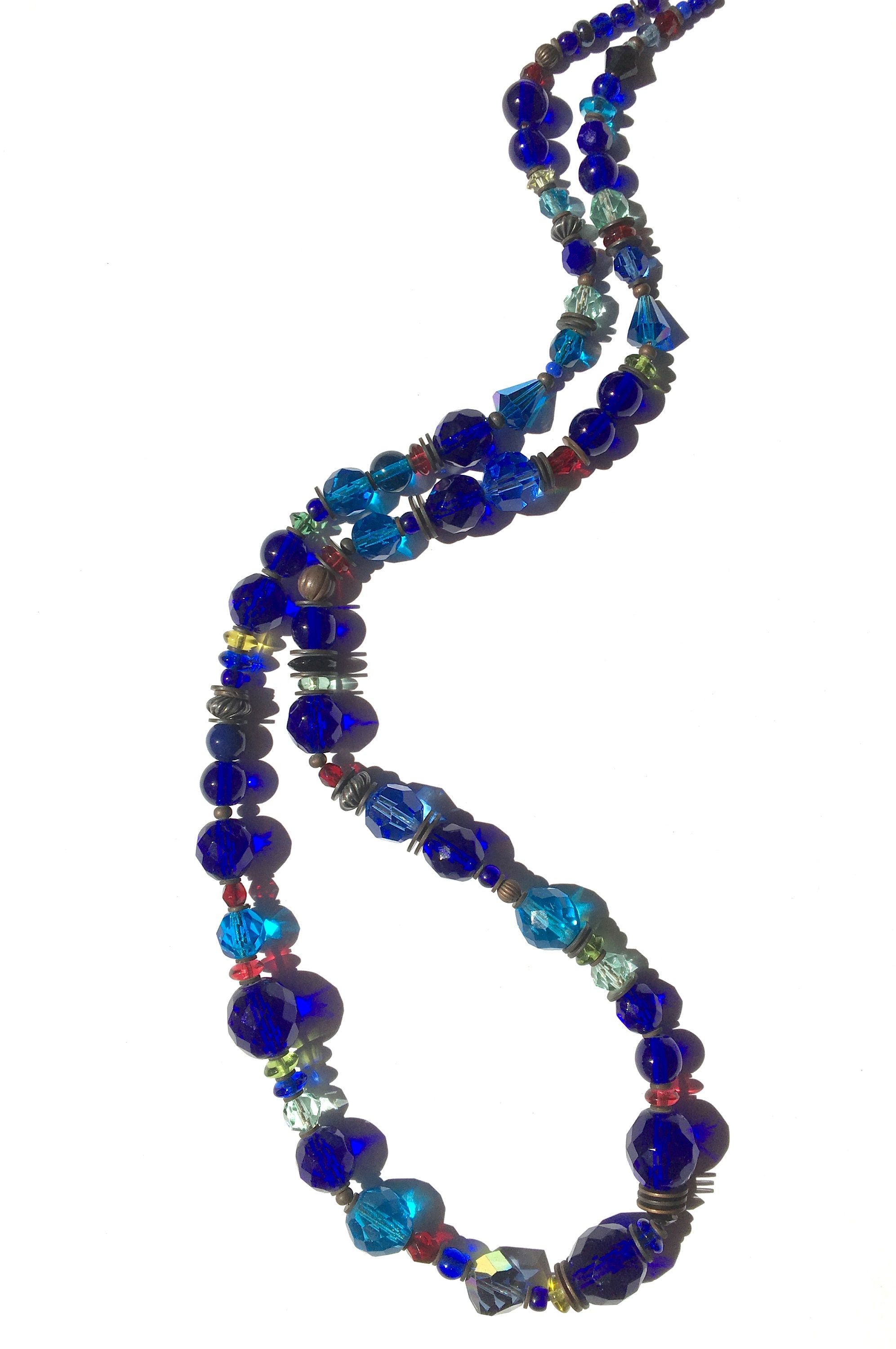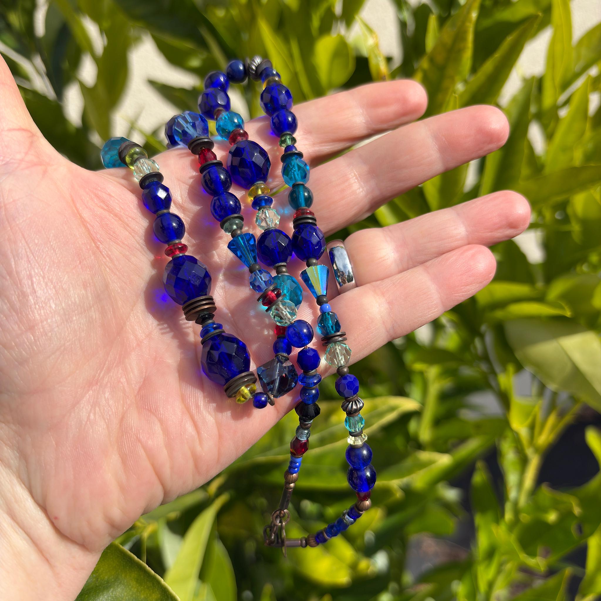 Blue glass beaded necklace. Austrian crystal and antique Czechoslovakian glass from our collection in shades of cobalt, aquamarine, citrus green, azure and peridot. Many of the beads are rare and irreplaceable, circa 1920-1930, originating from Czechoslovakia, Bavaria, Wattens, Kobe and Milano. Metal parts from our own tooling are antiqued bronze. "Portia Faces Life" is 24 inches long, handmade in the USA.