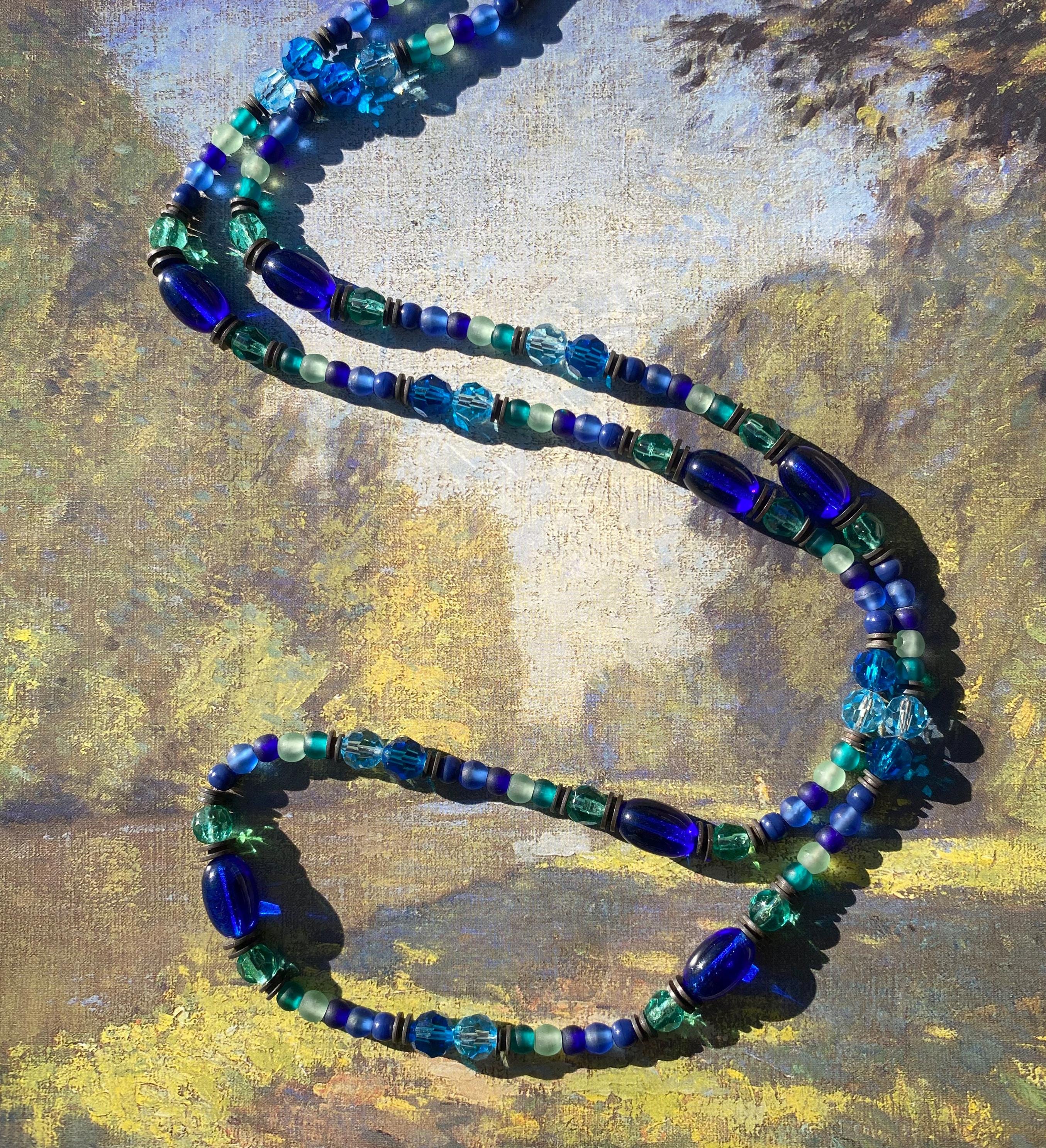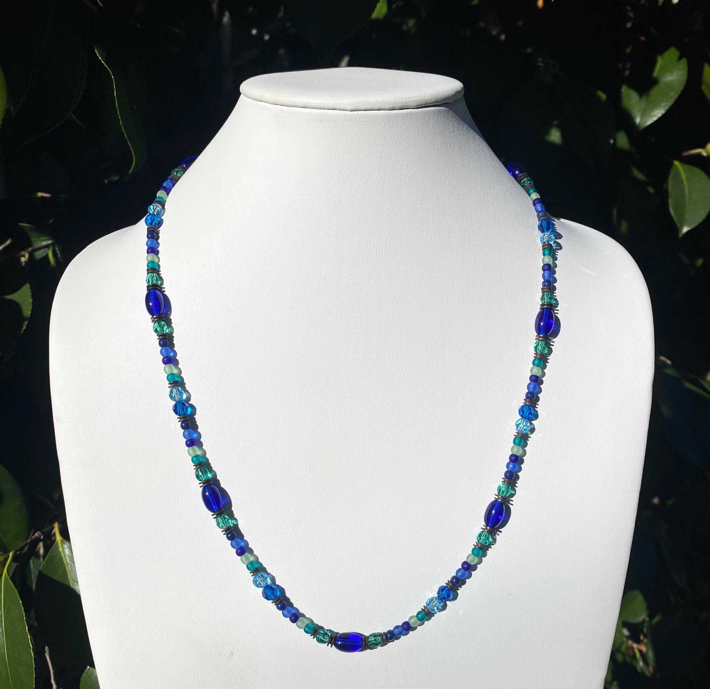 Blue 24-inch beaded necklace, "Tahiti." Austrian crystal and Czechoslovakian glass in shades of cobalt, aquamarine and peridot. Metal trim is antiqued bronze, from our own tooling. All handwork done in the USA.