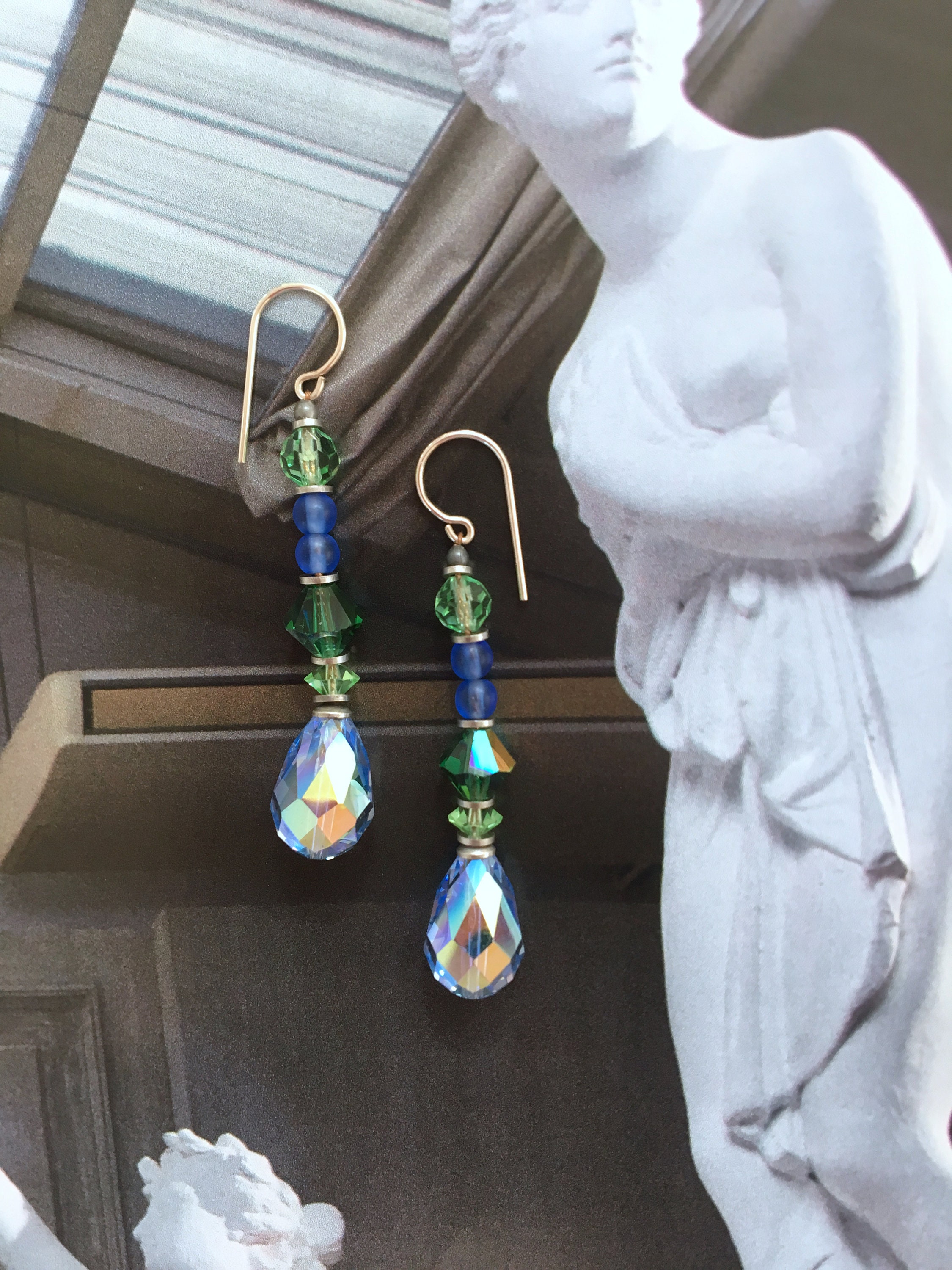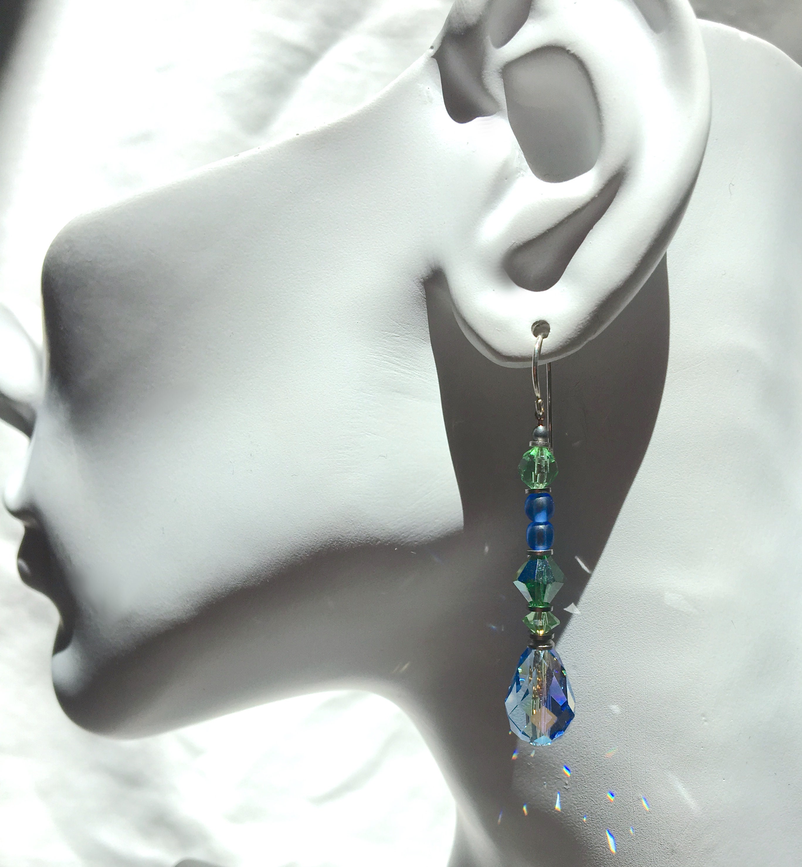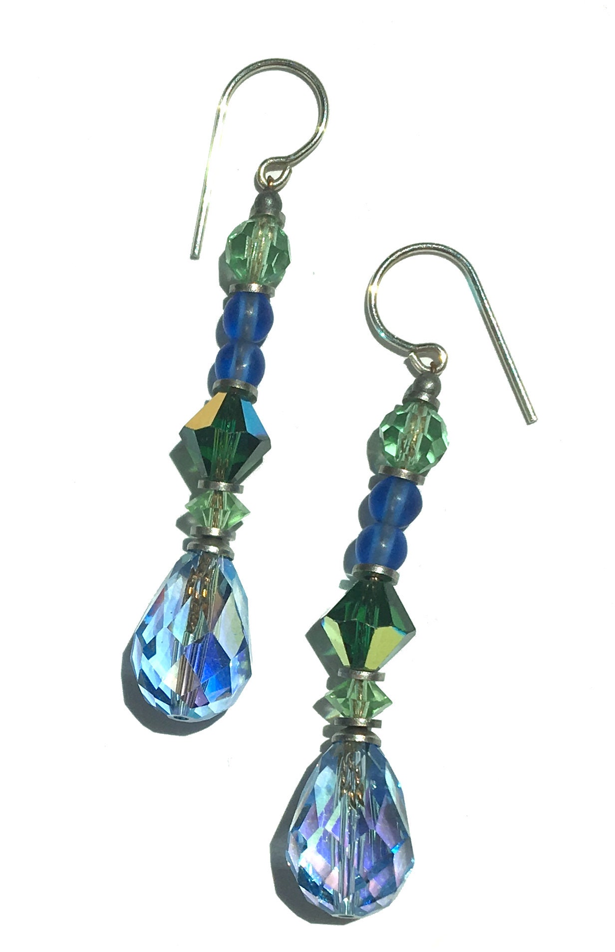 Faceted light sapphire Austrian crystal drop earrings with an iridescent shine. Accents are Austrian crystal, Czechoslovakian and German glass. "Style 500" earrings measure 1 3/4 inches long. Antiqued silver overlay accents with sterling silver ear wires. Also available with 14 karat Gold filled wires. All hand work done in the USA.