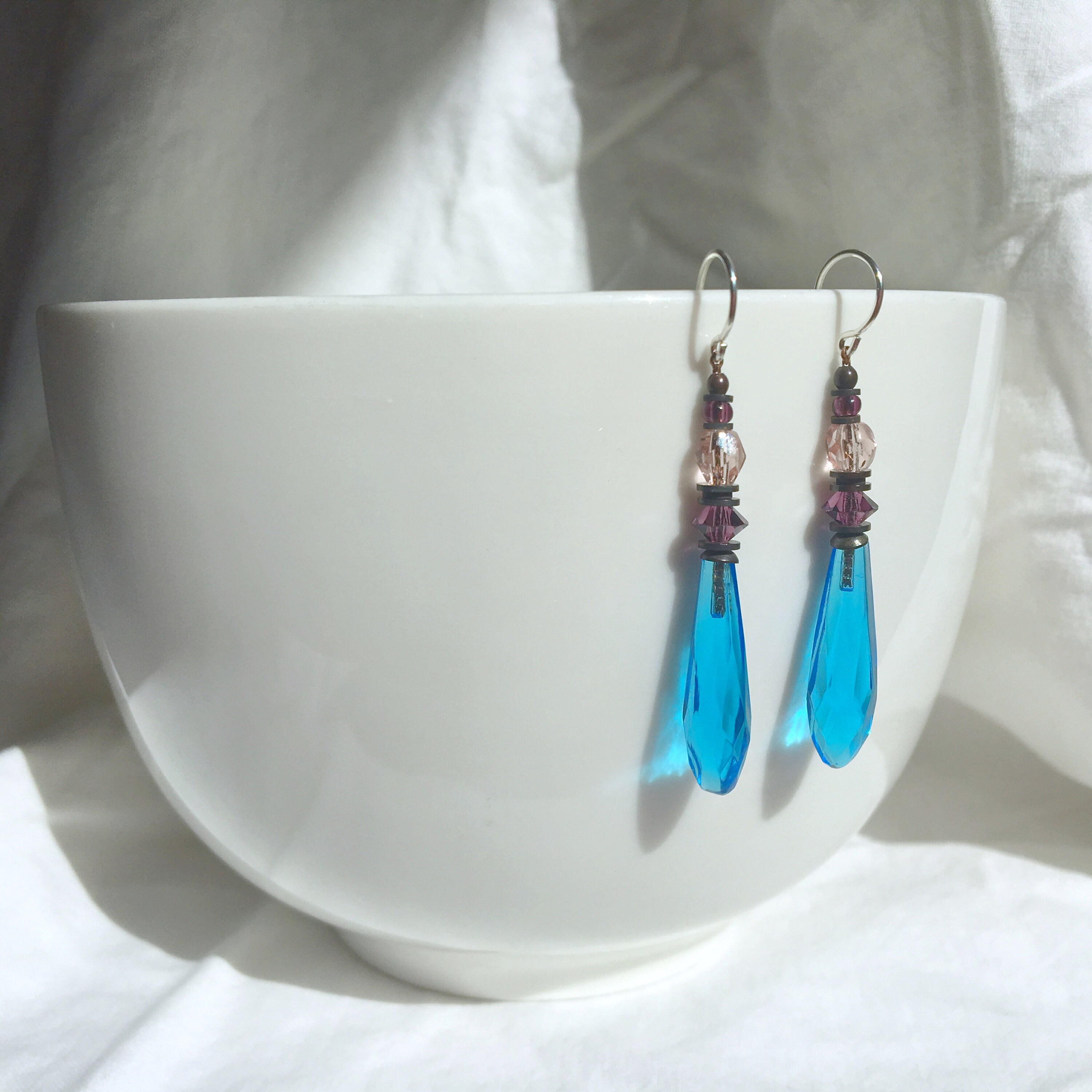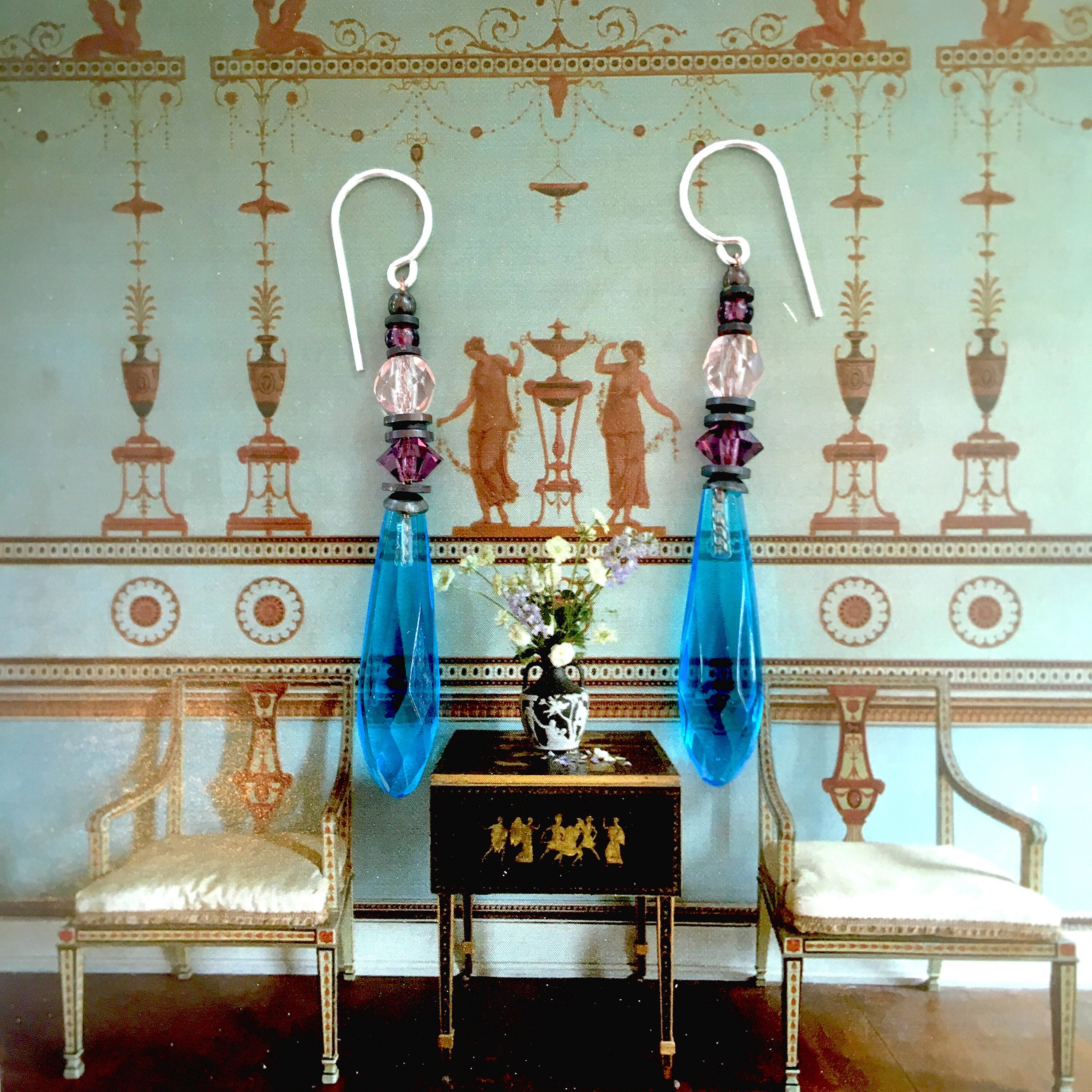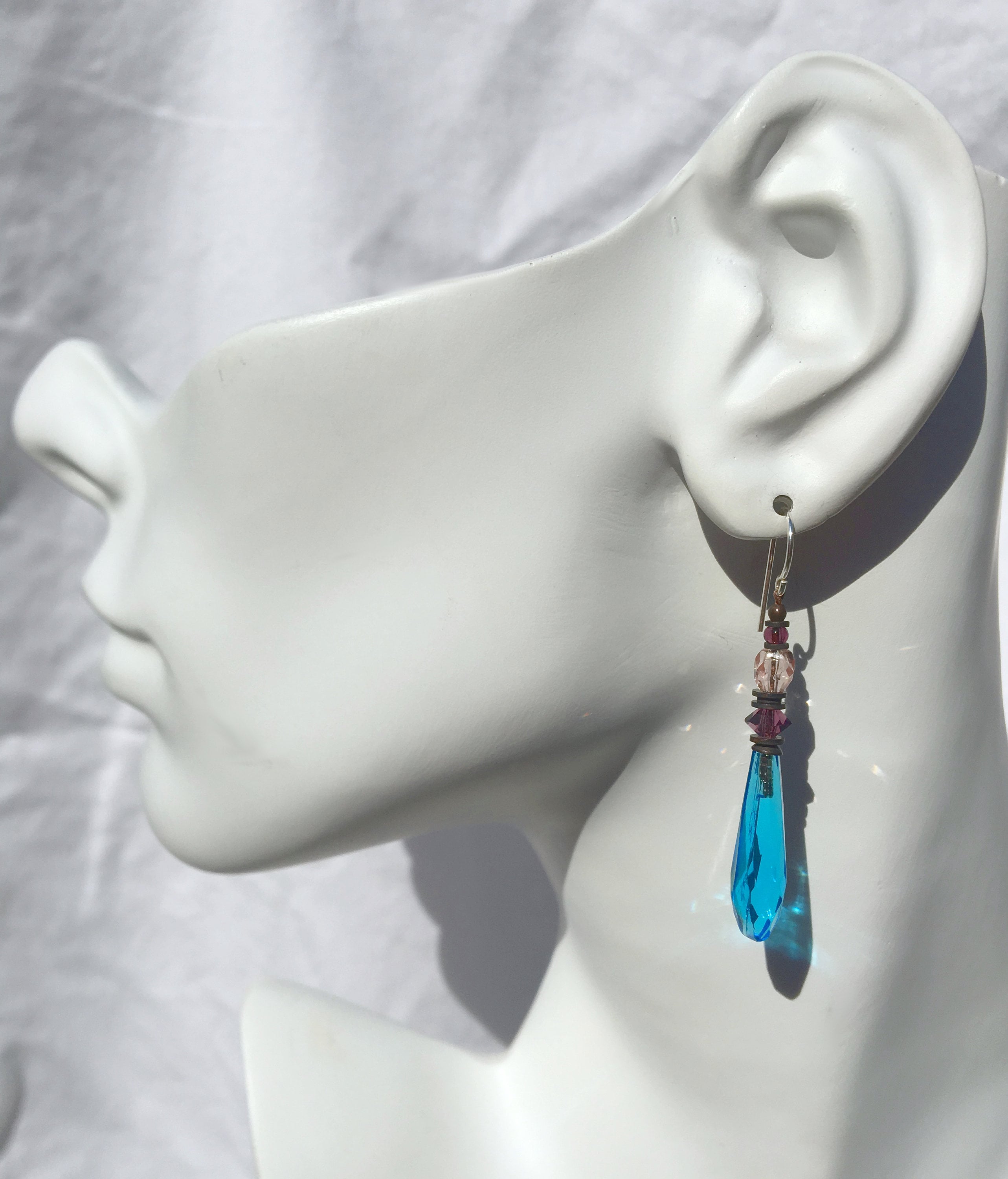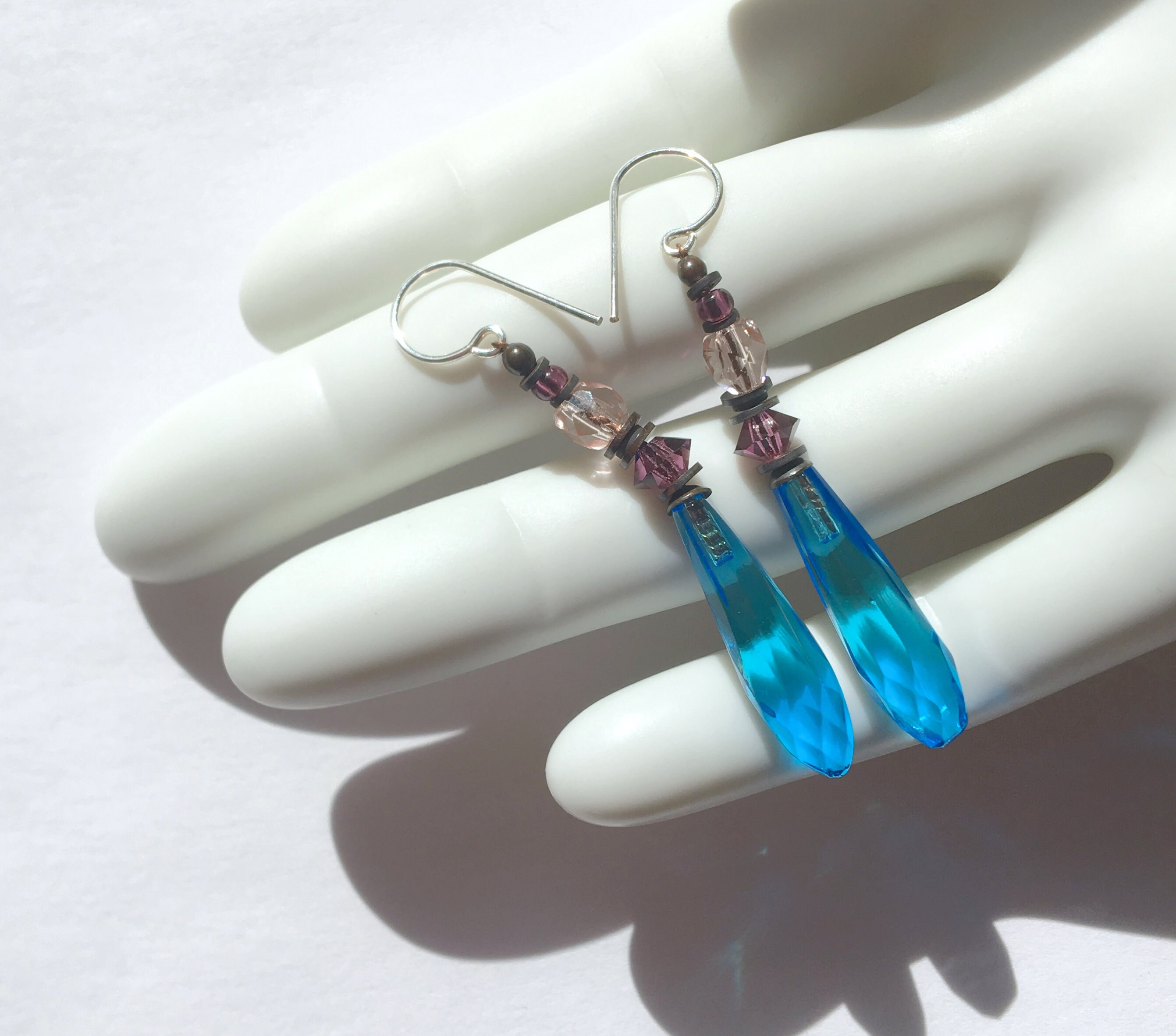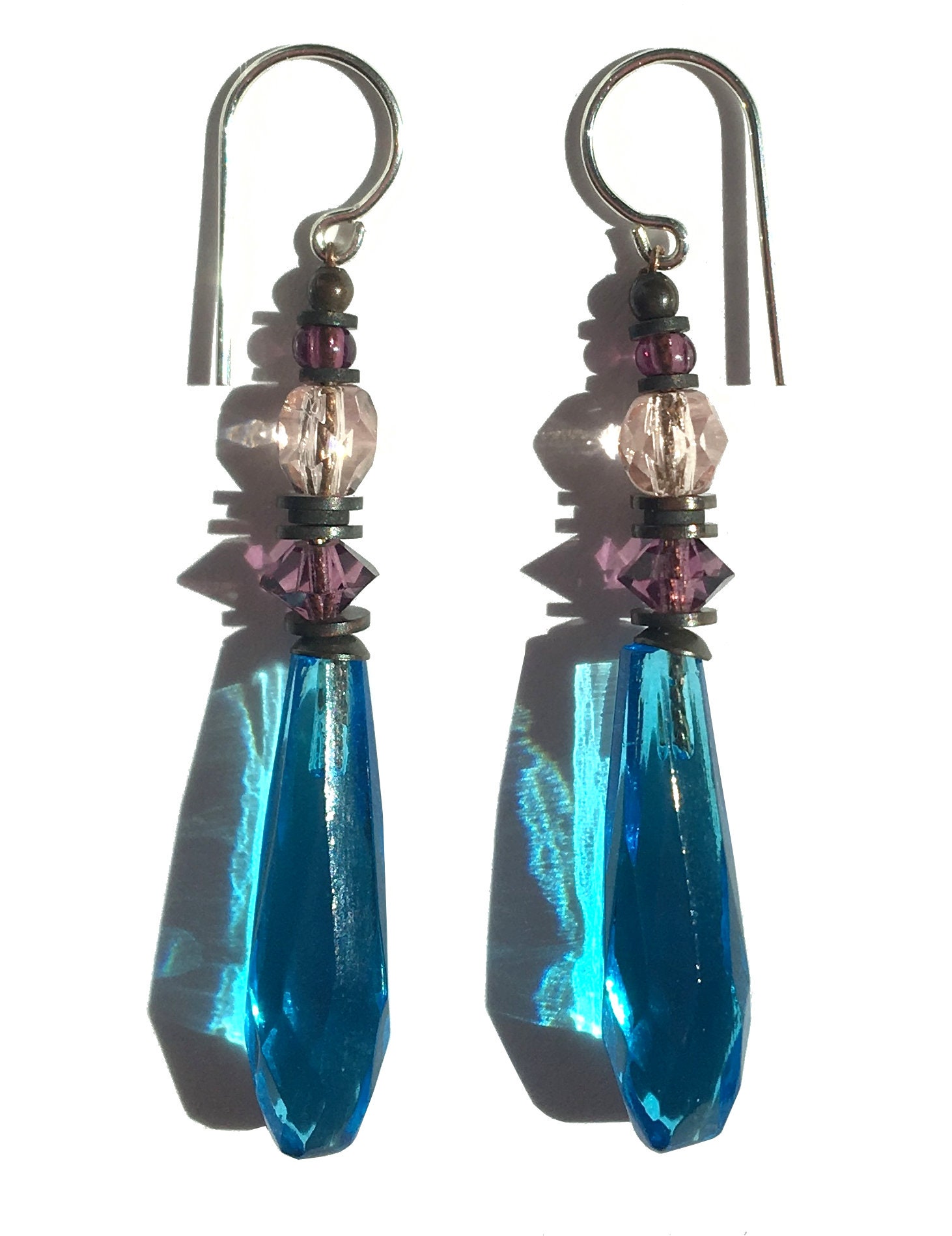 Bright turquoise glass prism earrings. Faceted chandelier glass drops, designed by Allen Owen and made for us in Germany. Austrian crystal accents in amethyst with pale peach and amethyst Czechoslovakian glass focal and top beads. Style "Souvenir 7" earrings measure 1 3/4 inches long. Trim is antiqued bronze from our own tooling. Ear wires are sterling silver. All handwork done in the USA.
