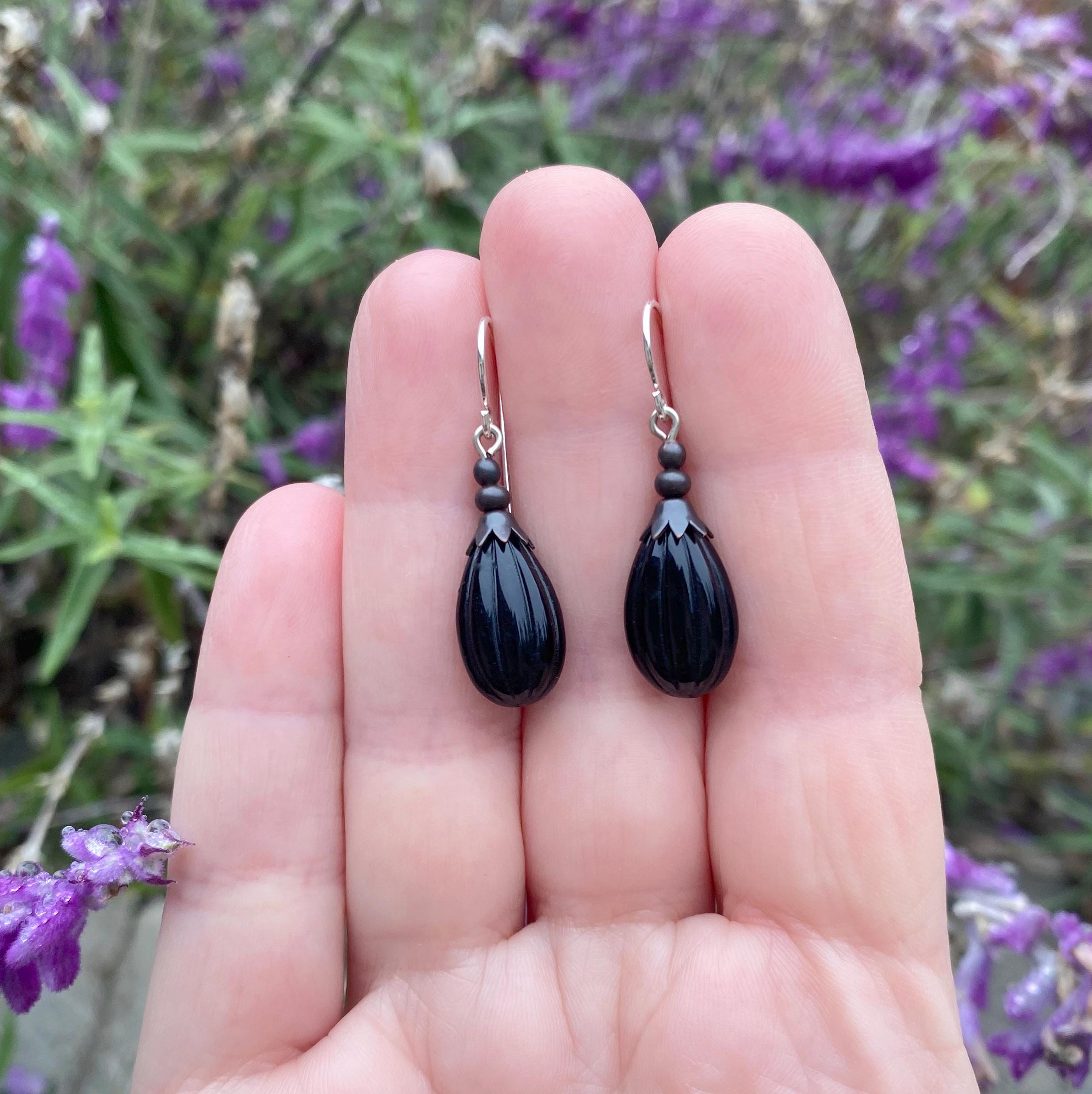 Jet drop earrings. These black fluted drops were designed by Allen Owen and are made for us in Germany. "Seedpods 15" earrings measure 7/8 inches in length. Metal trim is antiqued bronze with sterling silver ear wires. All handwork done in the US.