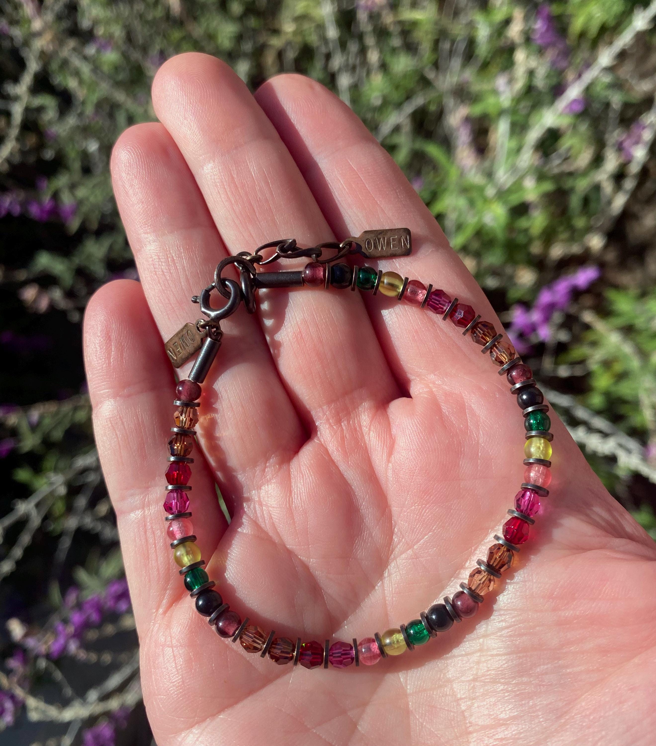 Crystal and glass stackable bracelet. Austrian crystal, Czechoslovakian and German glass from our collection in shades of pink, amethyst, emerald and smoke topaz. Metal accents, from our own tooling, are antiqued bronze. "Fantasia II" stackable bracelet is 7 inches long, handmade in the USA. A 1 inch extender is included.